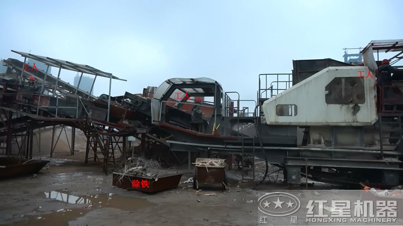 時產:100噸/時[1立方米=1.6噸],在破碎建筑垃圾混凝土固料時,要配置除鐵器,除去混凝土中的鋼筋。
