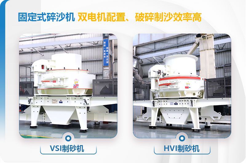 1.固定式碎沙機常用到有VSI制砂機(也就是沖擊式破碎機)、HVI制砂機,這兩種碎沙機需要固定安裝在石子碎沙作業現場,雙電機配置、破碎制沙效率高,能夠對≤50mm以下的石子進行碎沙作業,出料粒度均勻,兼有整形效果,是比較好的石子碎沙設備。