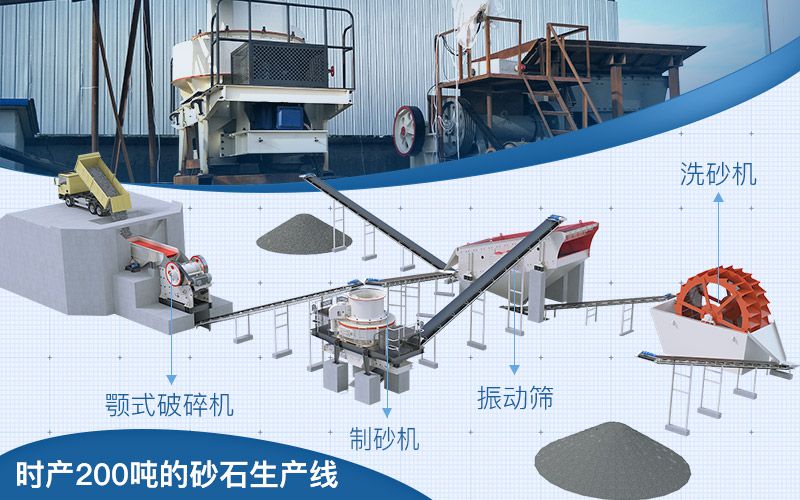 綜上所述,時產200噸的砂石生產線配置為給料機、皮帶輸送機、顎式破碎機、反擊式破碎機/圓錐式破碎機、制砂機、洗砂機、篩分機等。